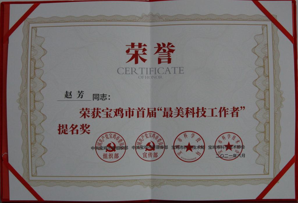 近日,6686体育官网股份赵芳在中共宝鸡市委组织部、中共宝鸡市委宣传部、宝鸡市科学技术局、宝鸡市科学技术协会联合开展的“寻找宝鸡最美科技工作者”评比活动中,被授予2021年“优秀科技工作者”提名奖。