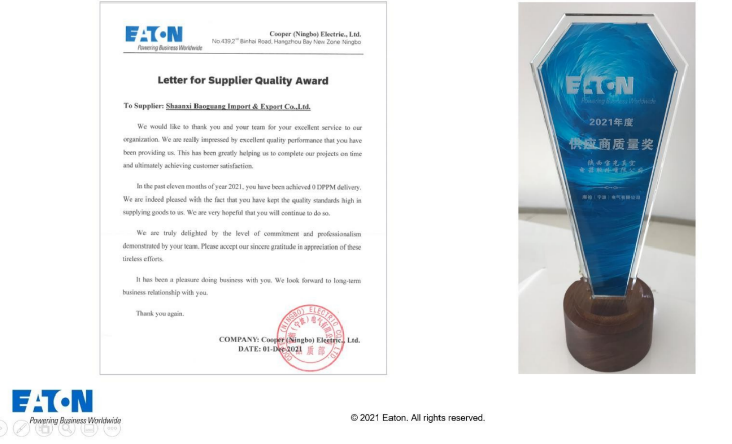 Recently there came a good news from Cooper (Ningbo) Electric Co., Ltd. Baoguang won the Supplier Quality Award in 2021. It symbolize that Baoguang has good performance to meet customers sanctification with excellent product, service and quality. Hence we build a firm basis to mutual strategic cooperation.