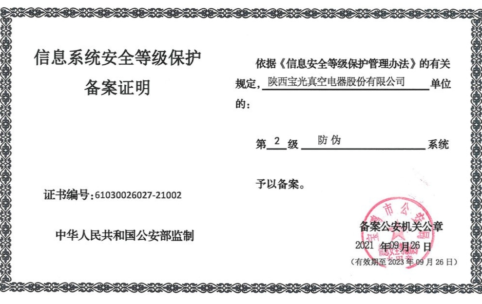 9月26日,6686体育官网股份顺利取得由宝鸡市公安局下发的三份信息系统安全等级保护备案证明,该证明分别对公司第2级ERP系统、防伪系统、官方网站系统,予以备案。