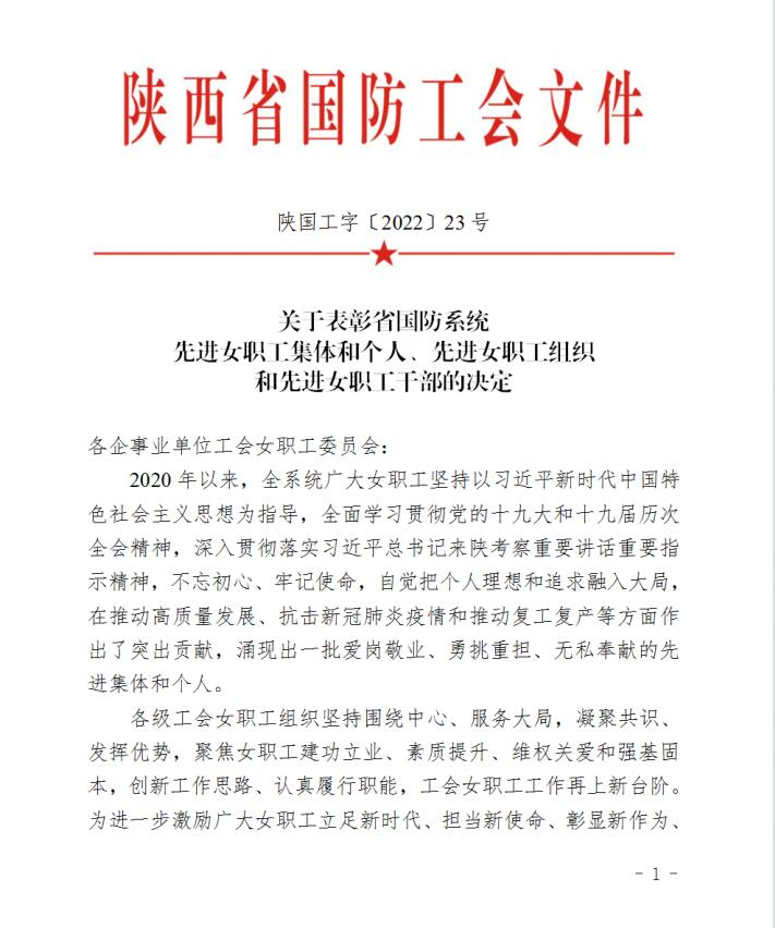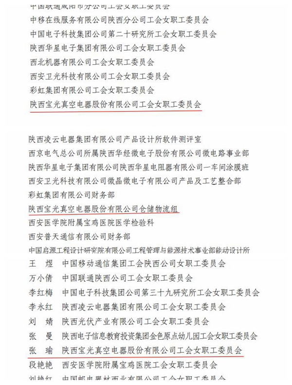 近日,从陕西省国防工会传来喜讯,陕西6686体育官网真空电器股份有限公司工会委员会女职工委员会被授予“陕西省国防工会先进女职工委员会”荣誉称号,生产管理处仓储物流组被授予“陕西省国防科技工业五一巾帼标兵岗”,工会办公室张瑜同志被评为“陕西省国防工会先进女职工干部”荣誉称号。