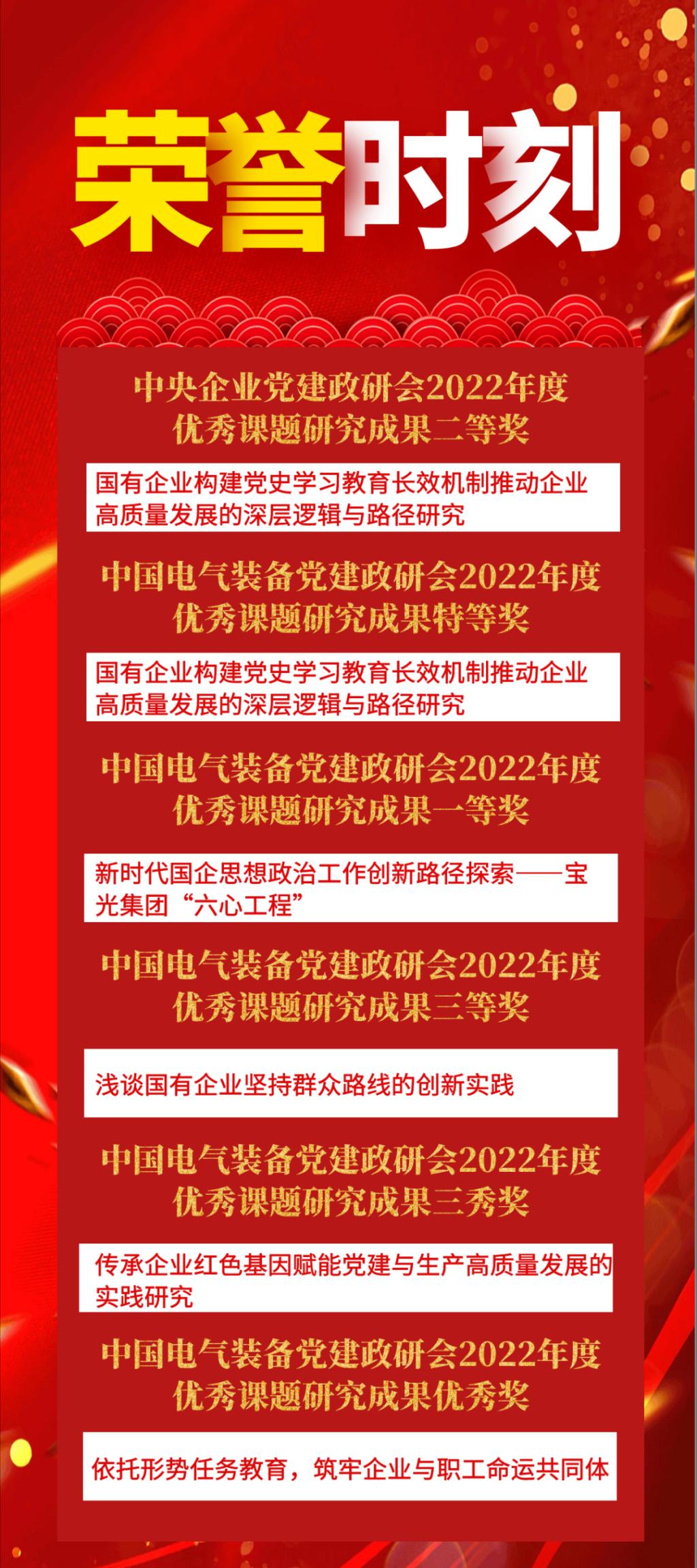 2022年,中国西电集团坚持以席大大新时代中国特色社会主义思想为指导,深入学习宣传贯彻党的二十大精神,按照中国电气装备党建政研会工作部署,立足企业实际,坚持问题导向,优化政研选题,聚焦研究重点,积极参加中国电气装备及以上政研会课题立项,切实抓好央企党建政研会和中国机械政研会课题研究,形成8项具有应用性和指导性的研究成果。同时,认真落实中国电气装备党建政研会工作要求,积极推进公司2022年课题研究工作,确定3个重点研究方向,下发参考选题25个,搭建5个课题组,审定立项课题89个,形成A类成果26个。2022年,中国西电集团荣获“机械行业政治思想文化建设贡献榜2021年度分榜上榜单位”与“2021年度机械行业机械红色故事宣传推广贡献单位”等荣誉,中国西电集团及所属3家企业政研成果入选“2021年度机械行业政治思想文化建设特色突出案例”。